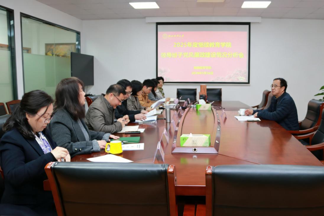 2026年3月16日下午,我院在文华校区惠康楼506会议室召开2025年度领导班子党风廉政建设情况分析会。校纪委委员龚刚敏到会指导,学院党总支成员、各部门主任参加会议。会议由党总支书记卢伟刚主持。