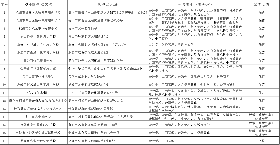 浙江财经大学2026年高等学历继续教育拟备案校外教学点及开设专业公示名单